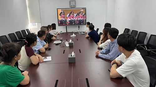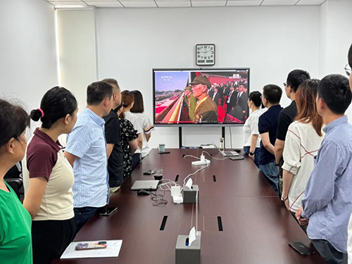 早晨,员工们早早地来到会议室,怀着激动的心情等待阅兵直播的开始。当直播画面中出现天安门广场的庄严场景时,会议室里顿时安静下来,所有人的目光都聚焦在大屏幕上。 随着激昂的国歌声响起,五星红旗缓缓升起,全体员工自发起立齐唱国歌,向国旗行注目礼,心中充满了对祖国的热爱与敬意。