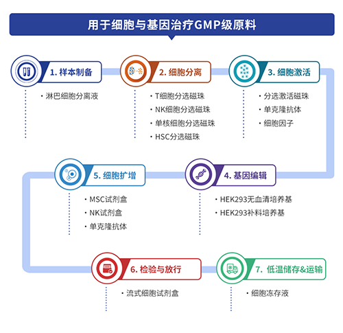 尊凯实业官网生物深耕CGT领域多年,扎根GMP级别核心原料的研发及生产,致力于为不同细胞疗法客户提供产品整体解决方案,覆盖细胞生产环节所需原料,包括样本制备、细胞分离、细胞激活、基因编辑、细胞扩增等,可助力客户临床研究及IND申报,加速推进细胞与基因治疗产业化。
